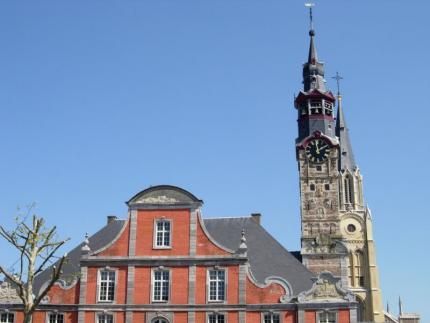 édification par la charte communale acquise au XIe s. construit en : 1366 : construction des halles flanquées d'un beffroi (peut-être en partie en bois). 1520-1530 : construction de la Vierge à l'Enfant figurant sur la façade (l'original est dans l'Hôtel...